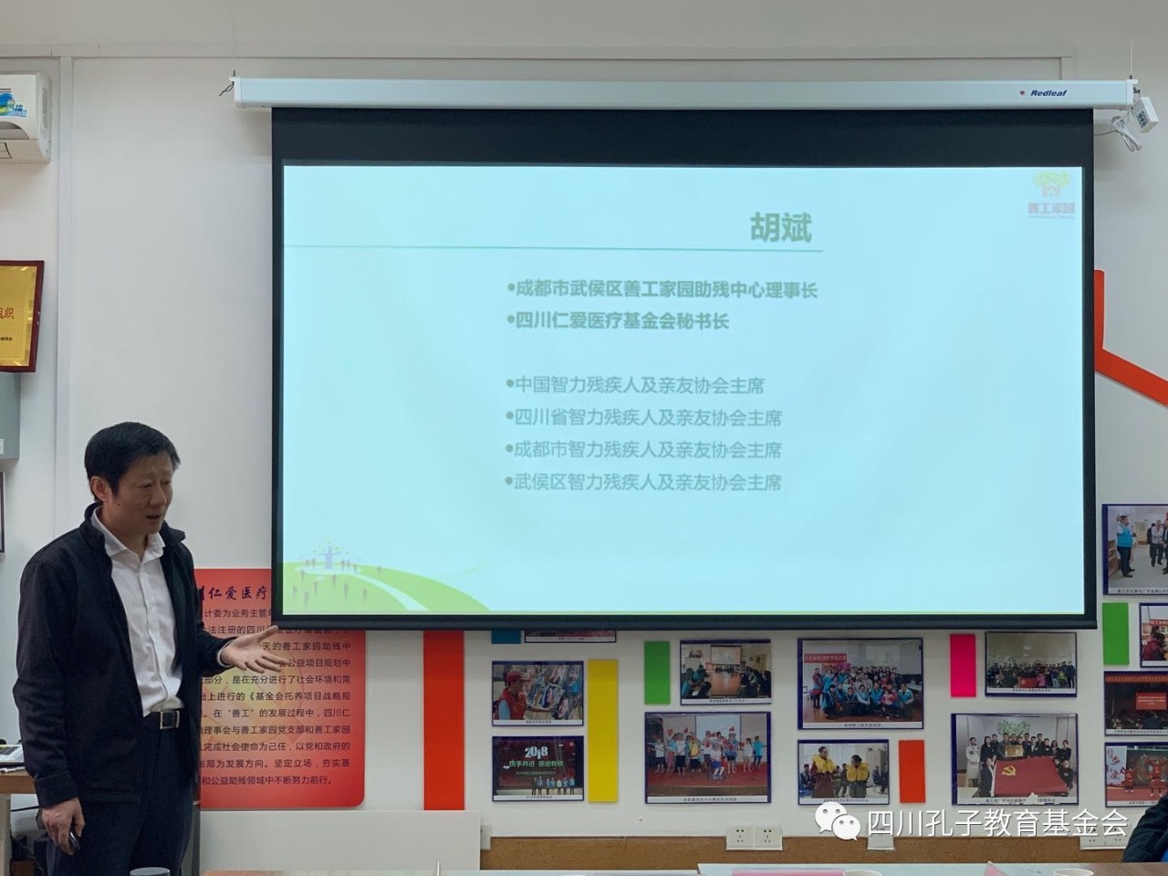 “人间**四月天” 2019年4月11日上午10:00四川孔子教育基金会2019年善工家园捐赠仪式在成都市武侯区善工家园助残中心206活动室举行。四川孔子教育基金会常务副理事长罗健,副理事长李光祥、郑永新,秘书长罗雪,执行秘书长李朝蓉,常务副秘书长黄莉萍,副秘书**圆员、邓跑跑、彭绍飞、王璐以及爱心志愿者梁桦茜;海纳公益负责人张珣;善工家园助残中心理事长胡斌、理事朱晓军、高健男等一行20余人参加了本次活动。