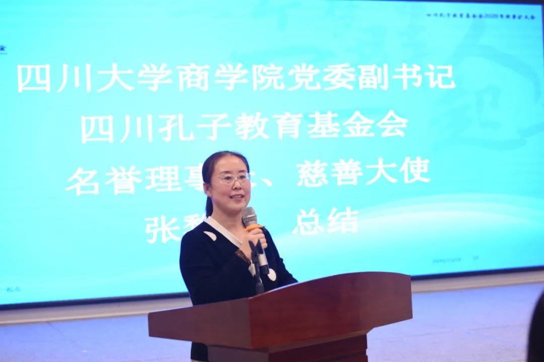 **四川大学商学院党委副书记、基金会慈善大使、名誉理事长张黎明教授总结讲话以感动、修己、爱人、安人这四个词总结今天的会议。下一个十年我们不仅要在善款筹措、团队建设方面加强,更要在助学、助教项目上做出亮点、做出特色、做的更加专业、细致。