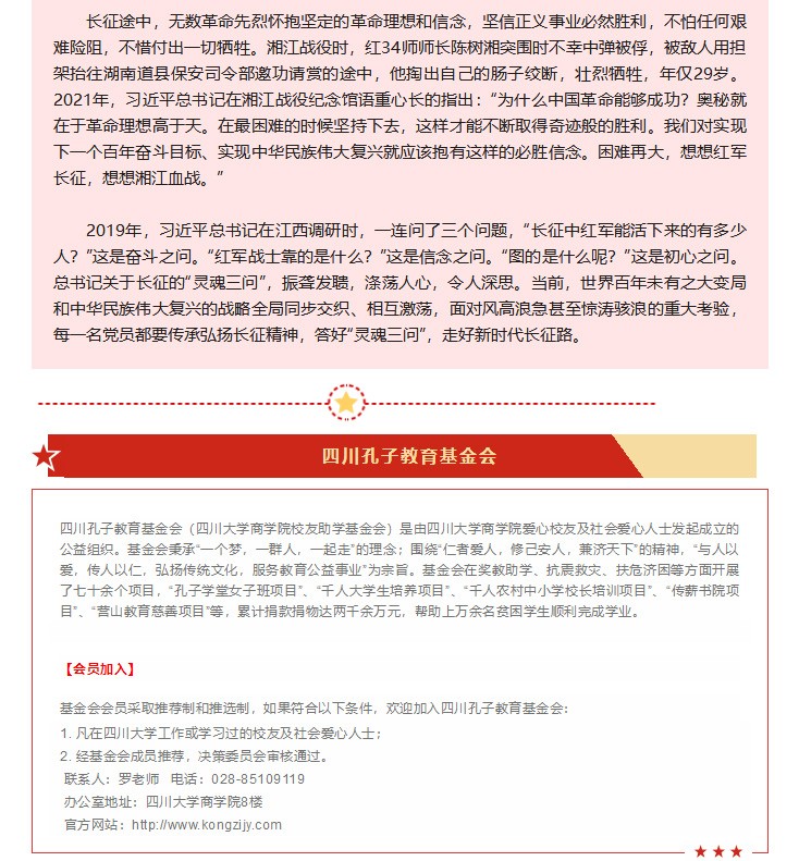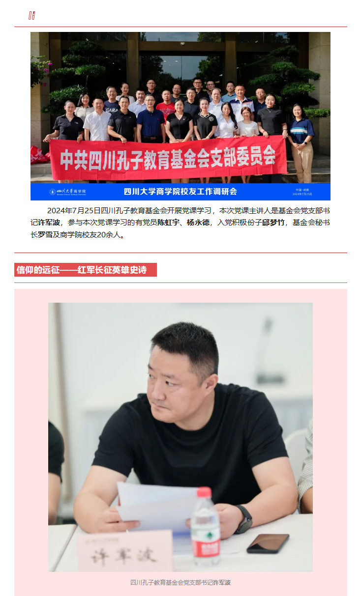 2024年7月25日四川孔子教育基金会开展党课学习,本次党课主讲人是基金会党支部书记许军波,参与本次党课学习的有党员陈虹宇、杨永德,入党积极份子邱梦竹,基金会秘书长罗雪及商学院校友20余人。