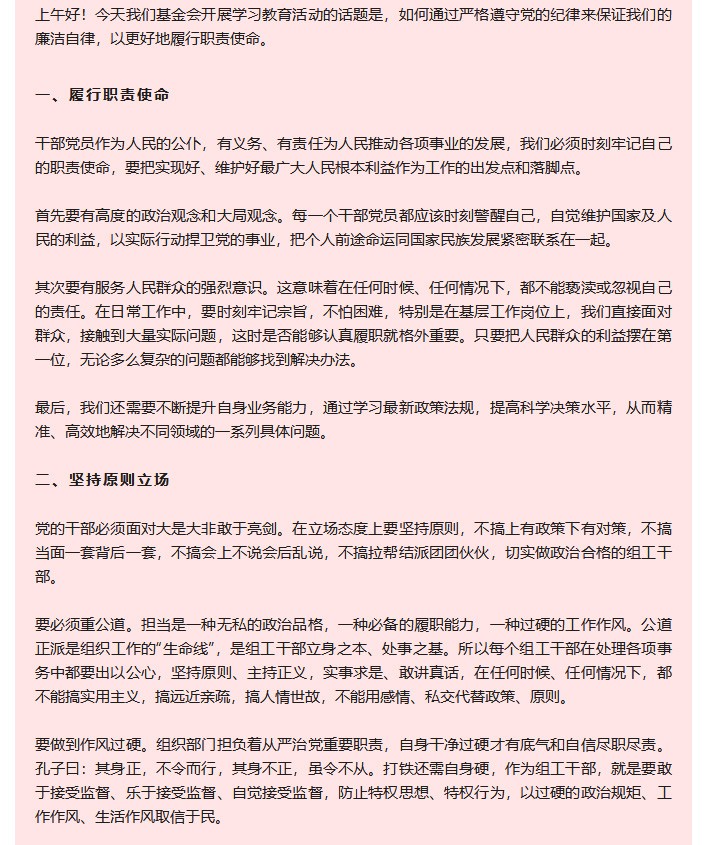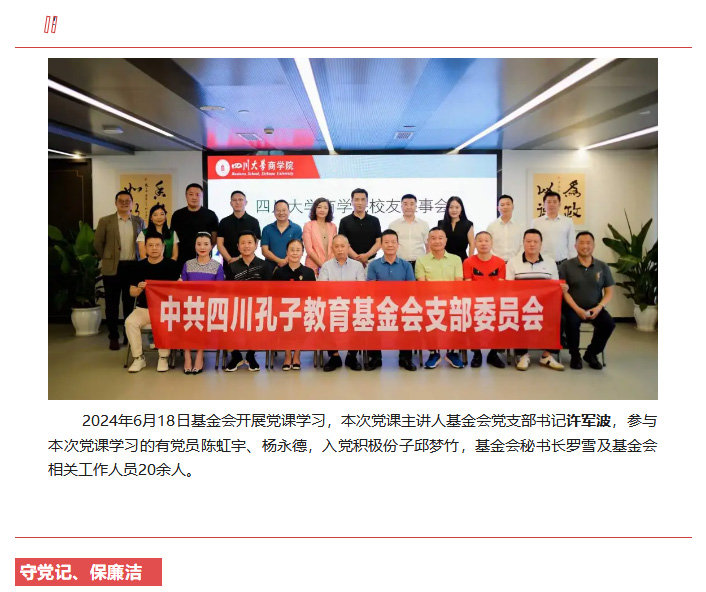 2024年6月18日基金会开展党课学习,本次党课主讲人基金会党支部书记许军波,参与本次党课学习的有党员陈虹宇、杨永德,入党积极份子邱梦竹,基金会秘书长罗雪及基金会相关工作人员20余人。