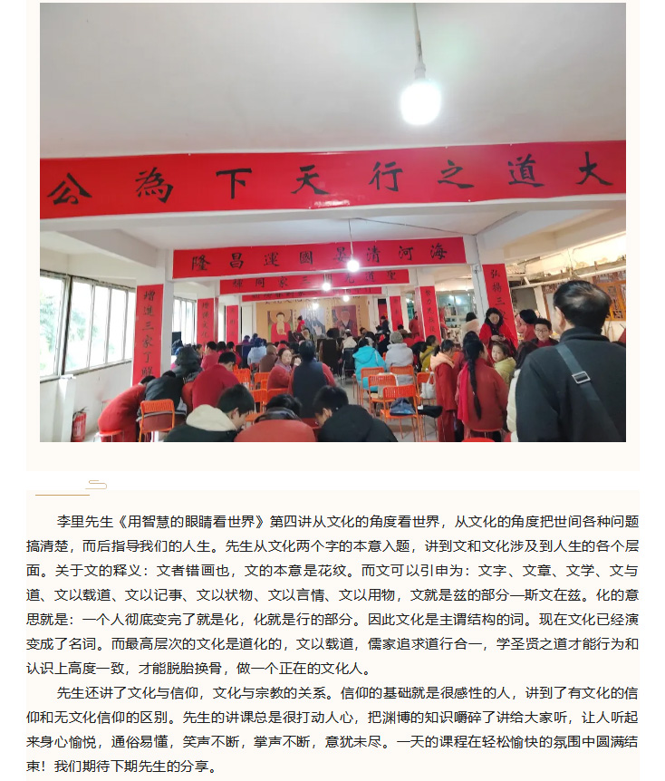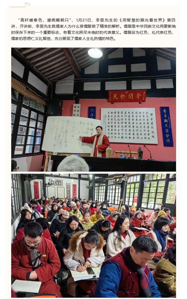 “高轩暖春色,邃阁媚朝只”,1月21日,李里先生的《用智慧的眼光看世界》第四讲,开讲前,李里先生就儒家人为什么穿儒服做了精准的解析。儒服是中华民族文化将要断绝时保存下来的一个重要标志,有着文化将尽未绝时的代表意义。儒服设为红色,礼代表红色,儒家的思想仁义礼智信,充分展现了儒家人主礼热情的特色。