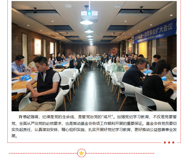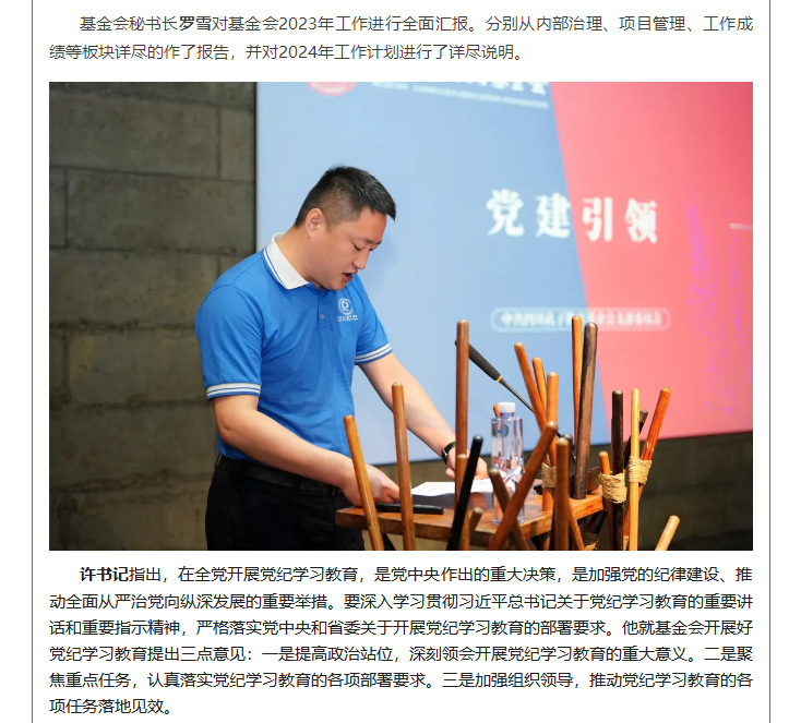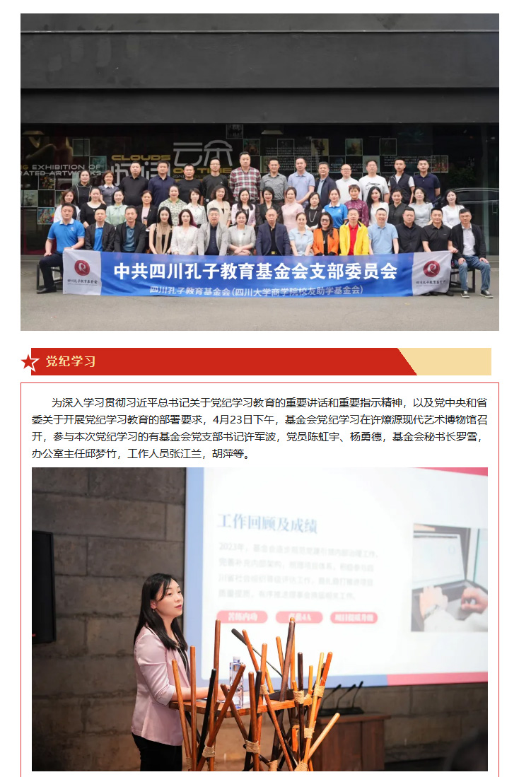为深入学习贯彻习近平总书记关于党纪学习教育的重要讲话和重要指示精神,以及党中央和省委关于开展党纪学习教育的部署要求,4月23日下午,基金会党纪学习在许燎源现代艺术博物馆召开,参与本次党纪学习的有基金会党支部书记许军波,党员陈虹宇、杨勇德,基金会秘书长罗雪,办公室主任邱梦竹,工作人员张江兰,胡萍等。