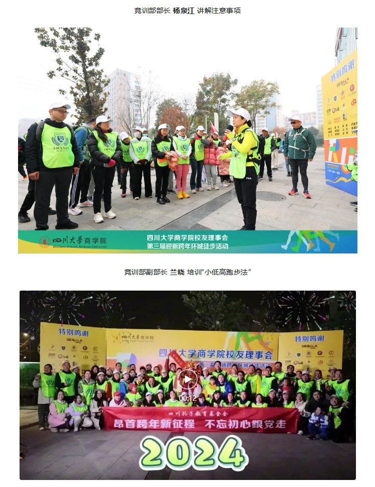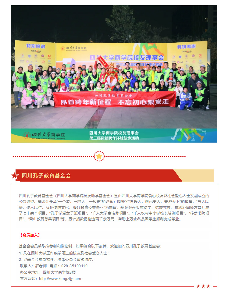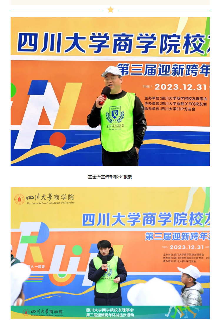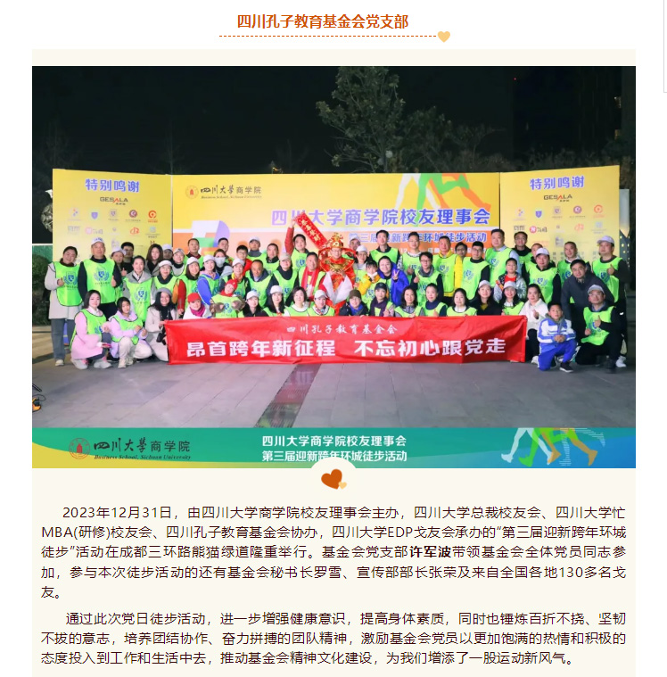 2023年12月31日,由四川大学商学院校友理事会主办,四川大学总裁校友会、四川大学忙MBA(研修)校友会、四川孔子教育基金会协办,四川大学EDP戈友会承办的“第三届迎新跨年环城徒步”活动在成都三环路熊猫绿道隆重举行。基金会党支部许军波带领基金会全体党员同志参加,参与本次徒步活动的还有基金会秘书长罗雪、宣传部部长张荣及来自全 国各地130多名戈友。
